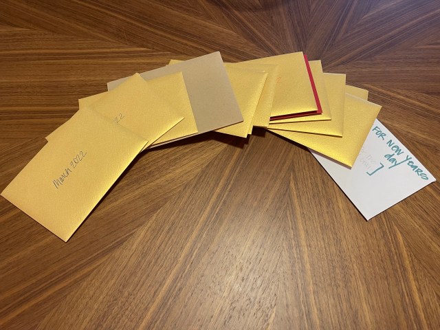 I’d written the 12 monthly cards, but I had four additional ones: one to myself after leaving an incredible team (who I now count among my dearest friends) at my previous job, one to Ken around his birthday in September, one to my sweet pup Kallie after saying goodbye to her in December, and one sent to me by my “paper twin” and bestie from college who definitely appreciates these kinds of rituals.