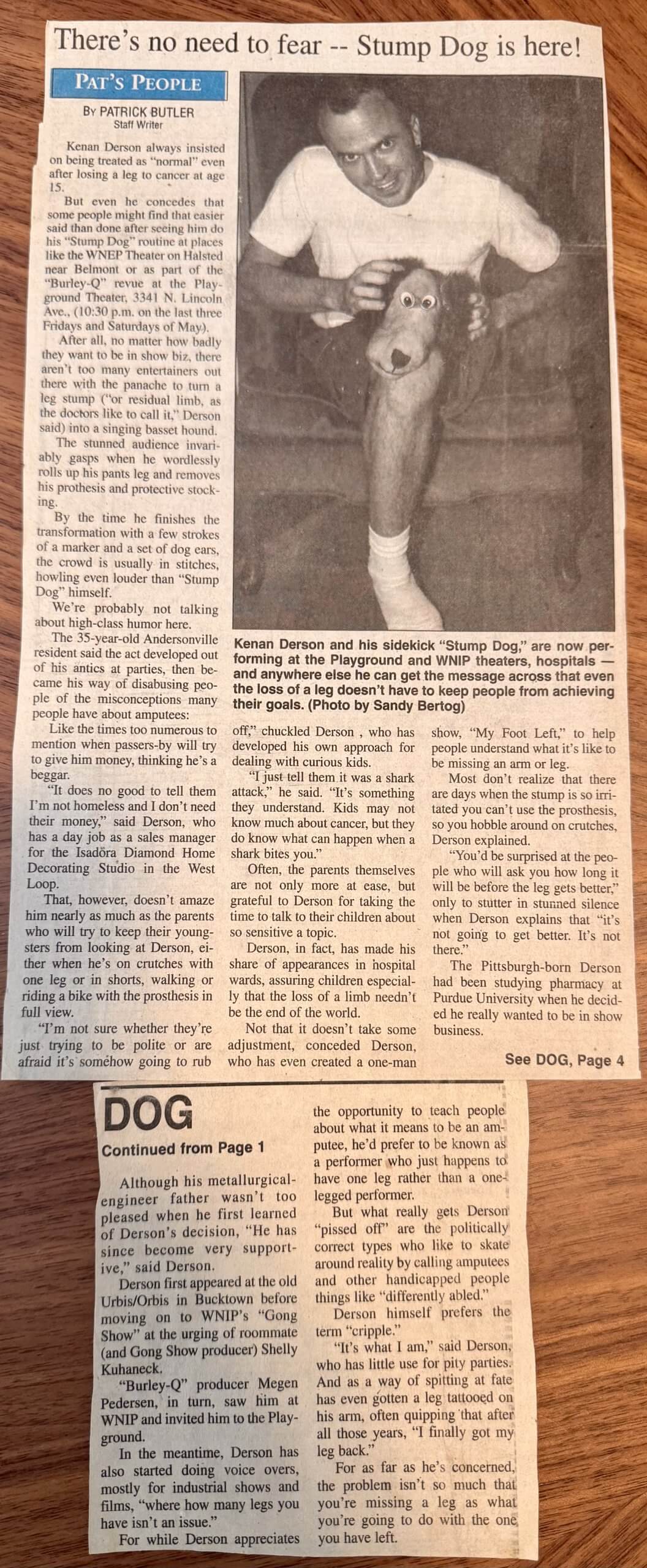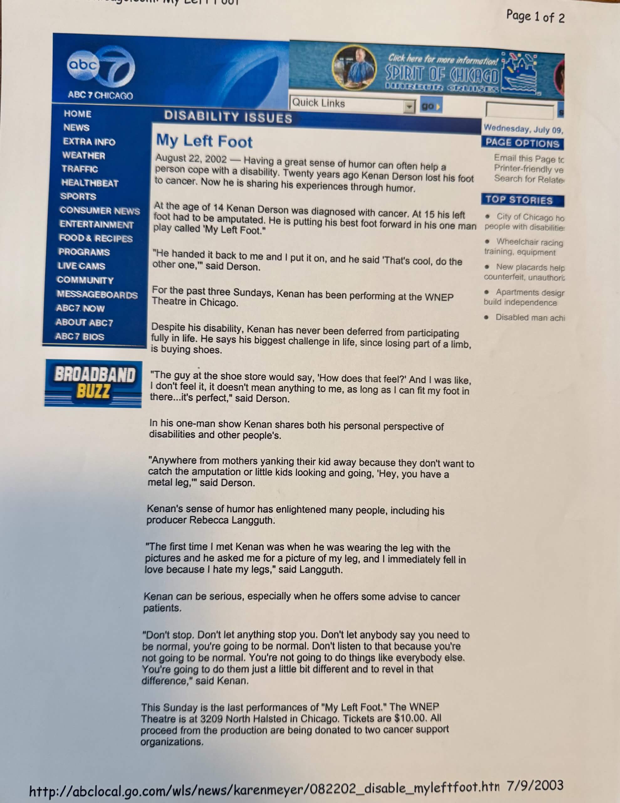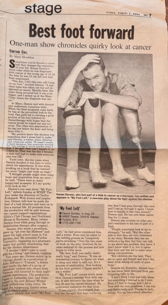 Ken wrote and performed a one-man show (also one-footed…he would have loved that joke) about his journey with cancer. Along with many friends, we put on the show at WNEP Theater in Lakeview for four Sundays in August 2002. Our friend, Bruce, a talented videographer, did us a great honor by recording one of the performances.